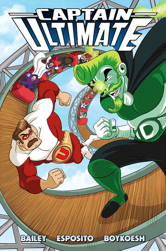 Thanks to some quick thinking, Milo helps get the other kids to safety and draws Dr. Destruction’s attention just to himself, but just as the villain prepares to swoop in for the kill, Captain Ultimate arrives on the scene and battles him to a standstill in the middle of an amusement park. After the villain is subdued, Captain Ultimate gets to work cleaning up the mess they made, and Milo invites him to come have dinner with his parents at his house. Milo’s dad is very pleased to meet the superhero, but Milo’s mom is concerned that other supervillains may now be coming after her son, just to get to Captain Ultimate. So the Captain announces his plan. He wants Milo’s parents’ permission to train Milo to be his official sidekick!
