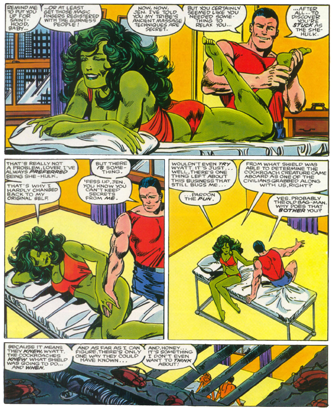 Except, wait, we still have no clue about the origins of that roach swarm, and if there are any more, and what they’ll do next (as far as I can tell, that storyline was never referred to again in any future Marvel comics), nor is there any explanation for how this evil agent Dooley (whom She-Hulk never gets proper revenge on in this story, as by the time she confronts him, he’s possessed by the roaches) got in charge of S.H.I.E.L.D. in the first place. And, apparently, after this, S.H.I.E.L.D. just lost all interest in She-Hulk, as they let her go and didn’t come after her again, nor where their any consequences for what they did to her here (you’d think the FF and other heroes would be pretty pissed when they found out…where’s Captain America when you need him?). So what the bloody heck was even the point of this story, other than to have She-Hulk repeatedly forced against her will to strip naked in front of strangers?!?