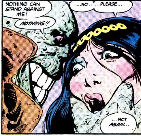 Now Barda is pleading, in terror, “not again.” Not WHAT again?!? You tell me what we’re supposed to assume in this scene? What has Sleez been doing to Barda, besides making her dance for him, while he’s had her under his control, that she’s so terrified of being forced to do again?!? Byrne would argue that any negative assumption made here is on the readers, since he doesn’t actually say or show what happened in this story…but come on! It’s obvious. And it’s gross.