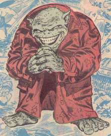 After tossing the pimp aside, some other dude grabs her purse and runs off, she chases after him, and he tries to ditch her by jumping down a manhole into the sewer. Where he is then grabbed by some unseen being with pink tentacles, who then hands the purse to SLEEZ (which would be a good title for this whole effed-up story), who is this little green creature: