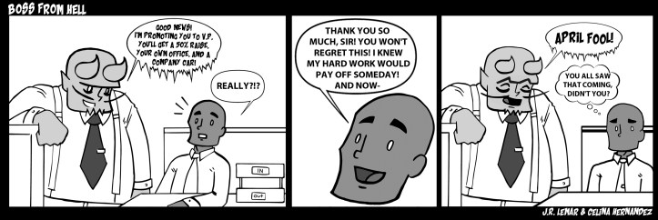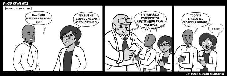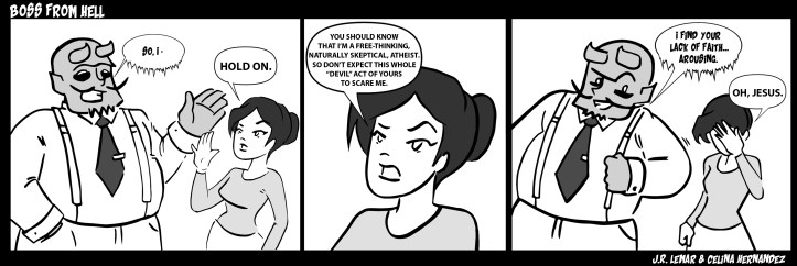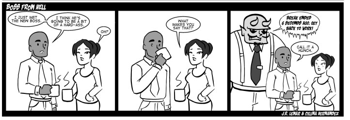 But as I was working on it, the phrase BOSS FROM HELL stuck with me, and I thought it would be more absurd to put that demonic boss, whom I was envisioning as a the class “Satan” look, but wearing a suit and tie, and stick him in a typical office-situation. And that morphed into a more tradition 3-panel comic. So I emailed Celina about it, sent her my idea, and she came back with this:
