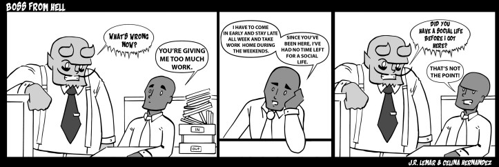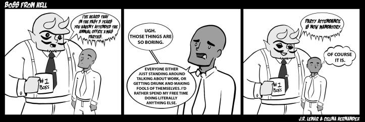 The boss is still just THE BOSS, he’s obviously SATAN/LUCIFER, but we don’t need to call him by name. I also haven’t decided whether I’ll ever name what company they work for, or what they do. For now it’s just a typical BIG CORPORATION, where a bunch of people work in cubicles all day long.