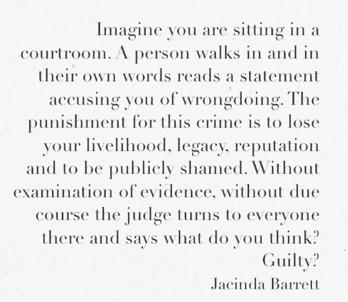 “Apparently, if you don’t say anything YOU’RE GUILTY. And if you defend yourself YOU’RE GUILTY. Call your accuser a liar and you’re “blaming the victim.” Try to suggest anything about her motives for lying, say anything about her background, and you’re a monster. Meanwhile, your background gets scrutinized with a fine-tooth comb.”