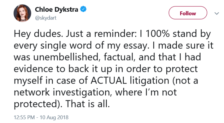 I’m sorry, but the combination of her sly way of writing about him, making it abundantly clear that it couldn’t be anybody but him that he’s talking about, but not naming, and claiming she has proof but refusing to share it, just further makes me doubt her story. If she has such definitive proof to back up her accusations, now’s the time to share it.