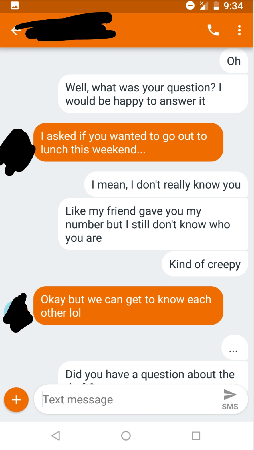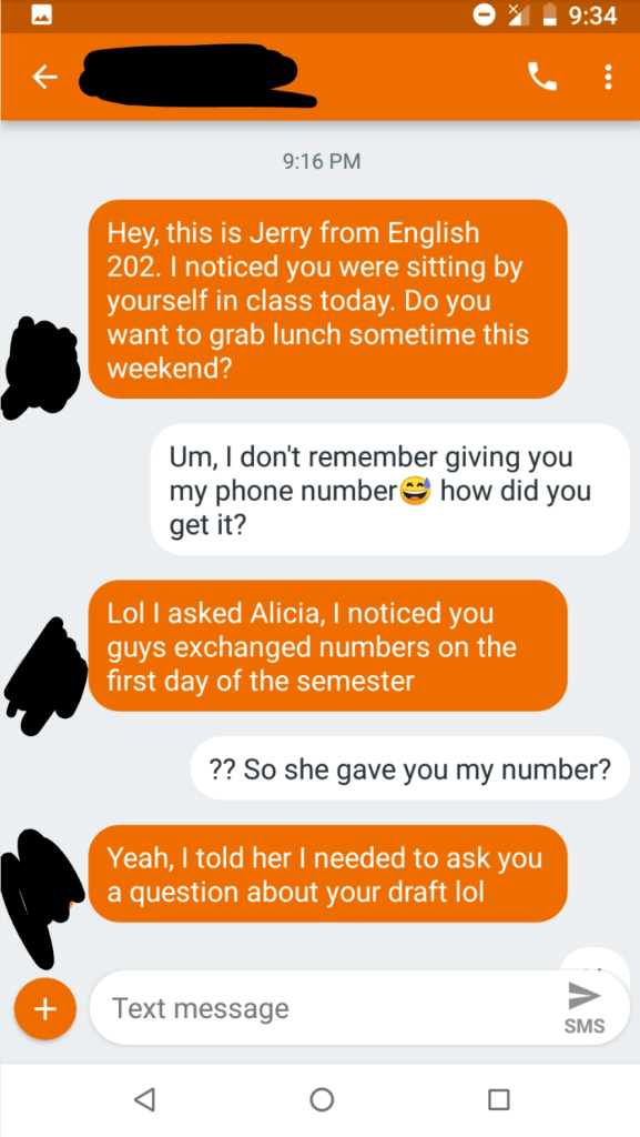 A woman posted this text exchange on Reddit. She was anonymous, but the background info she gave is that she’s a college student, and said that she didn’t recall ever speaking to this man in class, and therefore didn’t know his name or who he was when he texted her. And this is how the text conversation went: