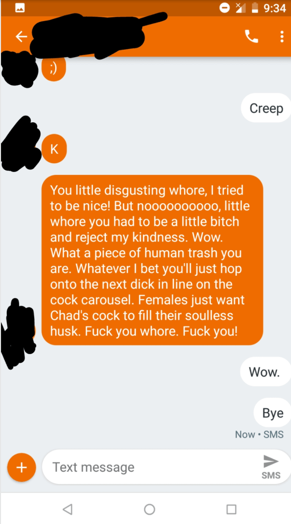It’s almost funny when he says I’m just trying to be a nice person, you looked lonely. Like oh, gee, he was doing her a favor, like she was some kind of charity case. What woman wouldn’t be flattered by that. But then of course there are predictable insults, dirty little bitch, your pussy stinks, etc. And “females just want…”