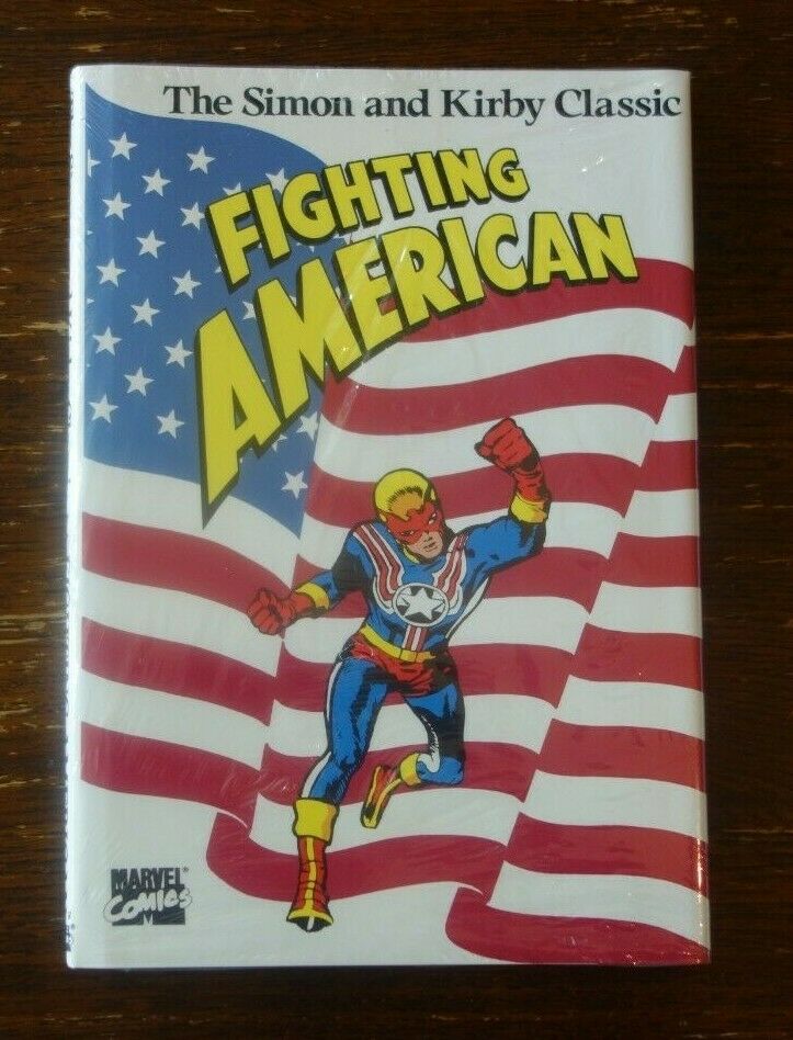 Unfortunately, this new hero did not take off the way Captain America had (superhero comics overall were on a decline during this era, which is why Marvel wasn’t even publishing Captain America comics at the time). The Fighting American only lasted for 7 issues. 11 years later a single issue was published by Harvey Comics. The first picture above is of a hardcover edition that Marvel published in 1989, which recollects all 8 of those issues, plus includes a previously unpublished 3-page story that Joe Simon wrote but an uncredited artist drew. I bought that comic in 2010 and that’s what I’m utilizing for this review today. A year later Marvel would reprint it with a new cover as a paperback, which is the second image.